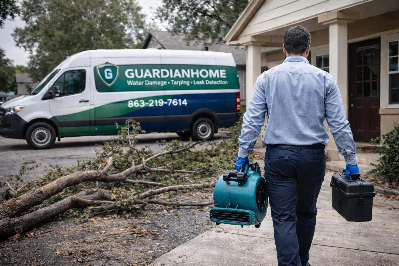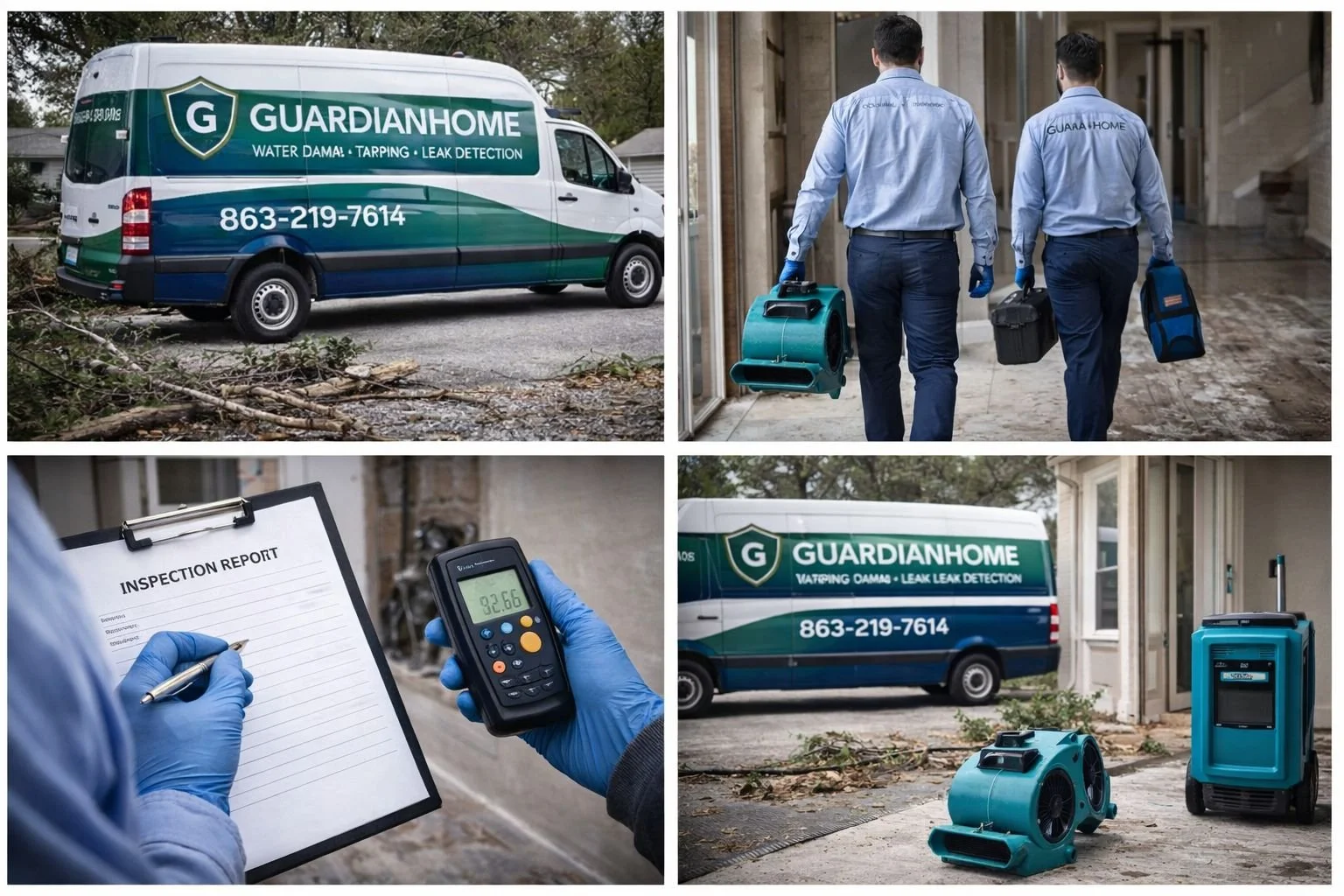 GuardianHome provides immediate water damage mitigation, roof tarping, leak detection, and property inspection services.